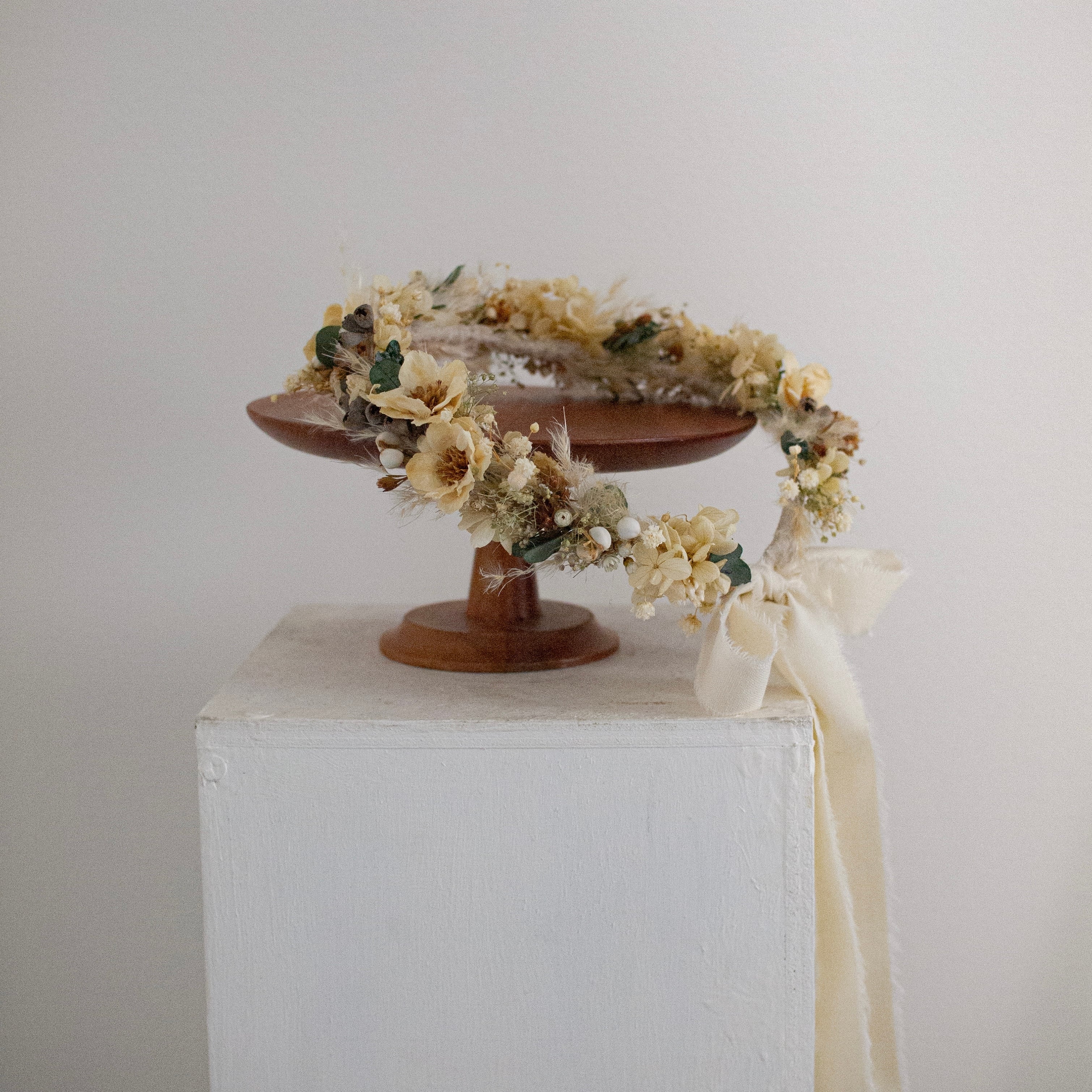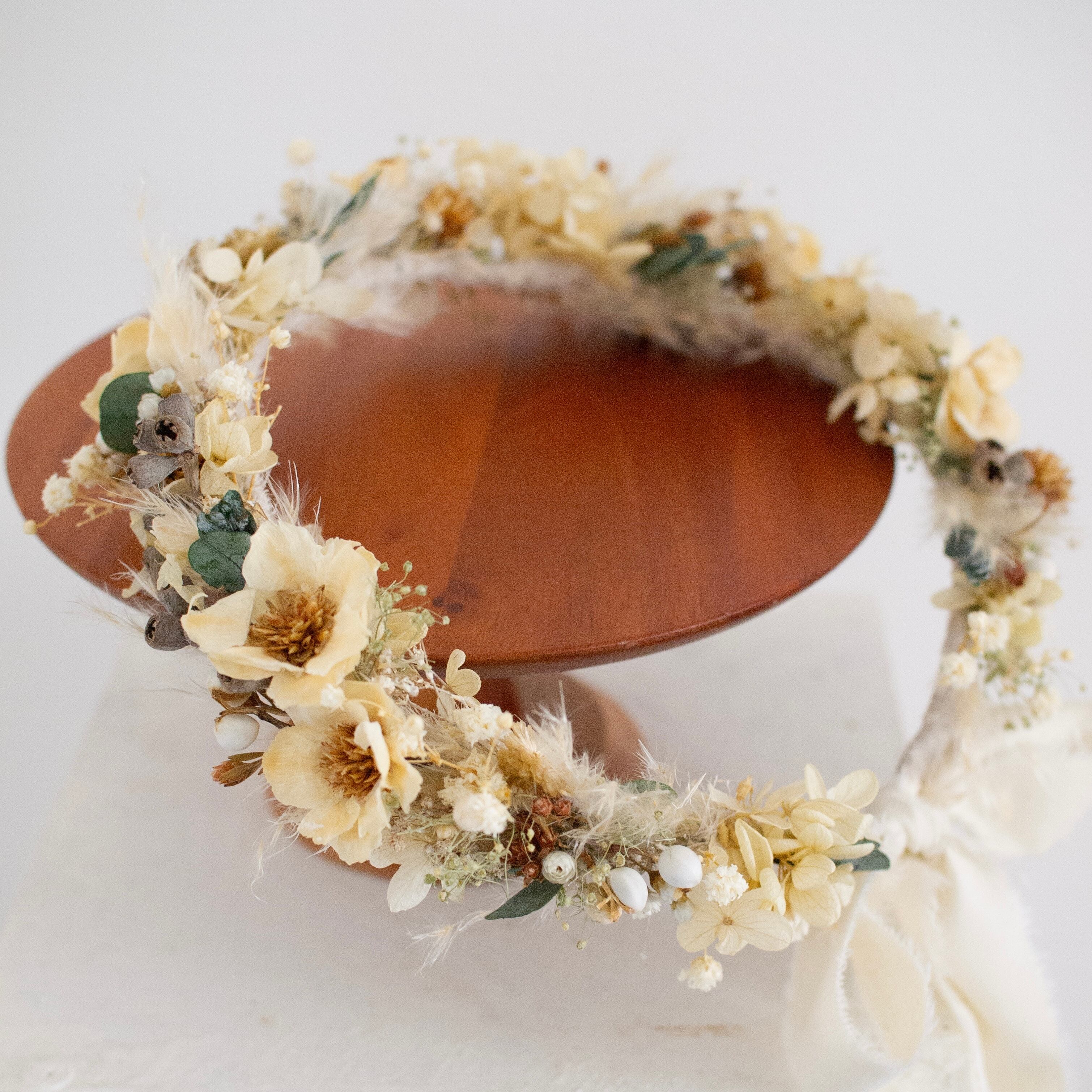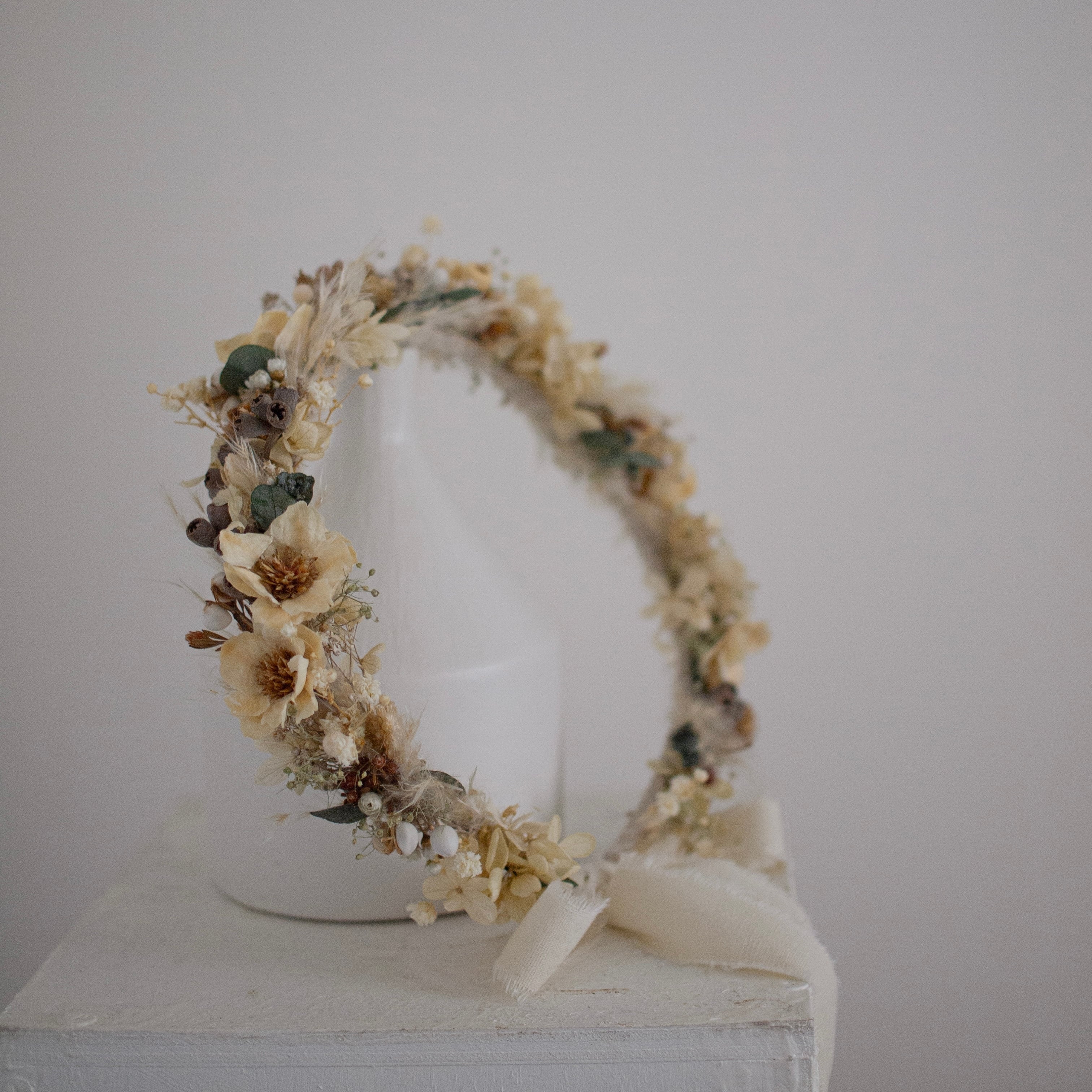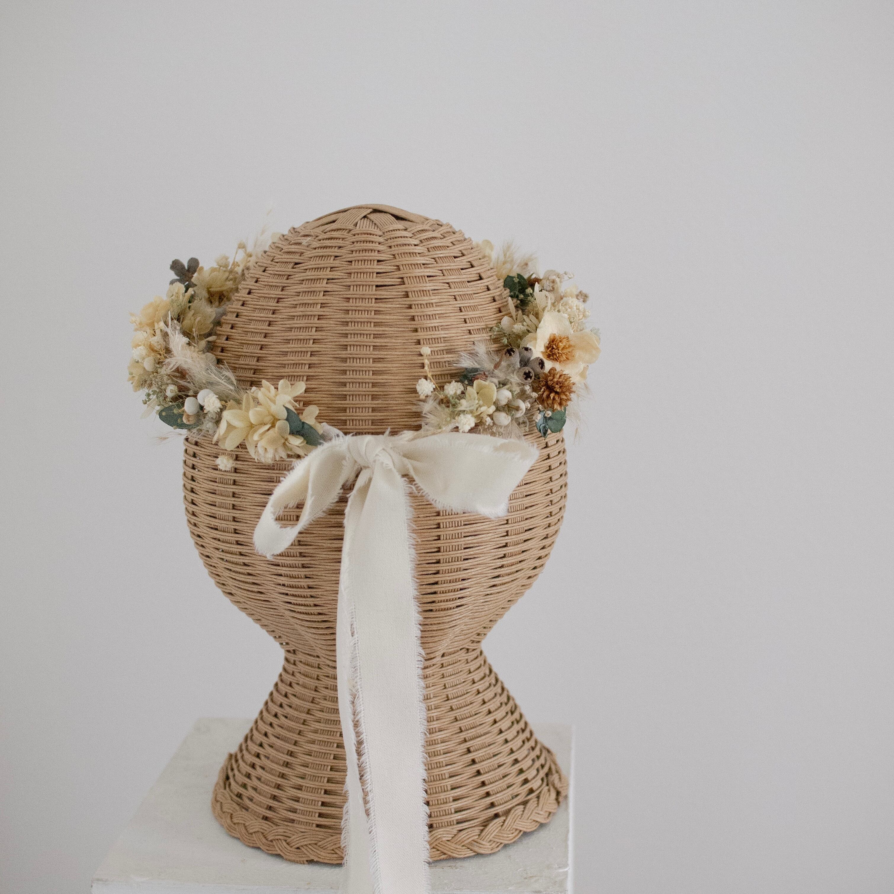 リボンで結んで輪にするタイプの花かんむりですので、細かなサイズ調整がしやすい仕様です。